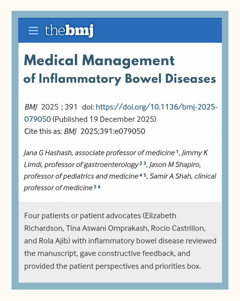 Our very own Tina Aswani-Omprakash, MPH, had the opportunity to contribute to a recently published BMJ State of the Art Review on the medical management of IBD. Written for healthcare providers, the review summarizes current evidence on IBD diagnosis, prognosis, and treatment, with an evolving focus on patient-reported outcomes.
