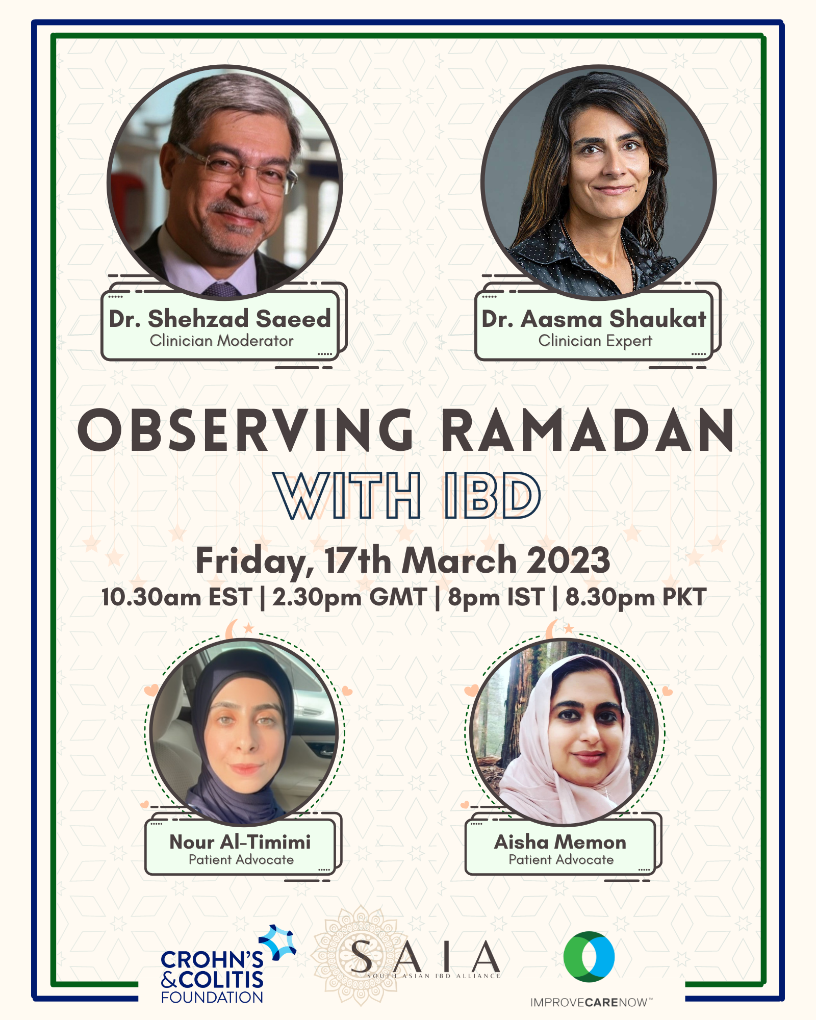 As Ramadan approaches, SAIA in partnership with the Crohn’s & Colitis Foundation and Improve Care Now is proud to bring to you this very important patient-clinician collaborative event on Observing Ramadan with #IBD!