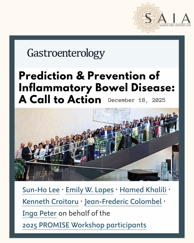 Two of SAIA’s Leaders, Dr. Parakkal Deepak and Tina Aswani-Omprakash, participated in the recent PROMISE Workshop at Mount Sinai and on an important new publication in Gastroenterology called Prediction & Prevention of Inflammatory Bowel Disease: A Call to Action.