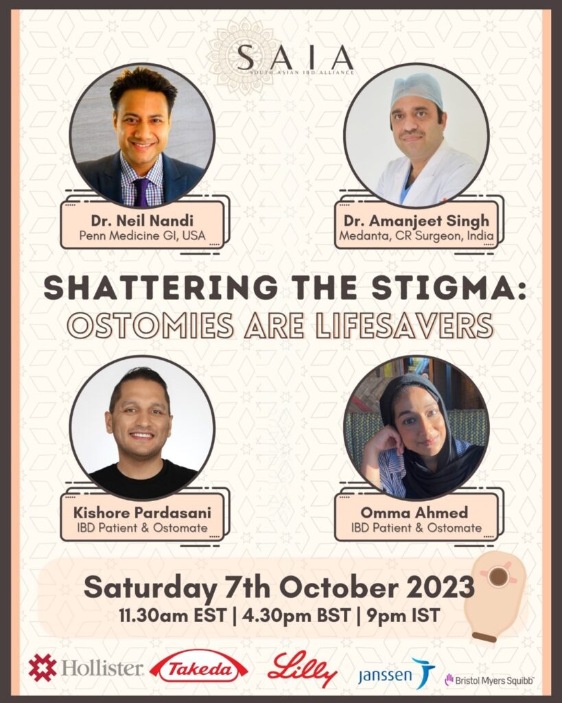In honor of Ostomy Awareness Day, SAIA leader, Dr. Neil Nandi (IBD specialist from Penn Medicine, US), moderates a robust discussion on #SouthAsian cultural considerations of life with an #ostomy on FB Live: “Shattering the Stigma: Ostomies are Lifesavers.”